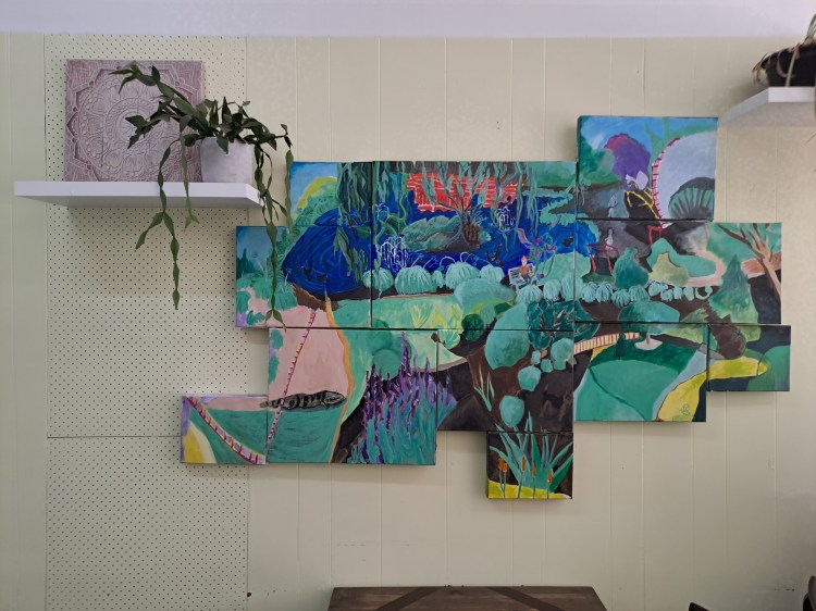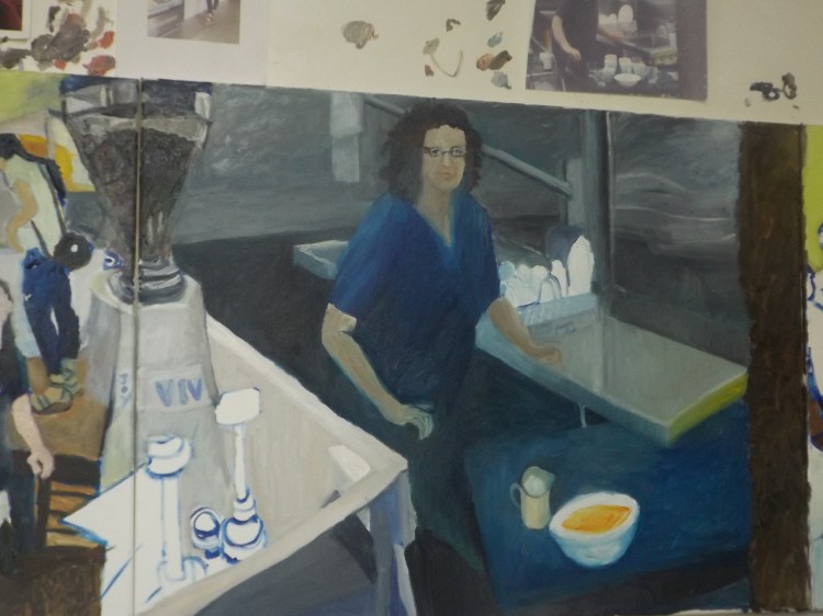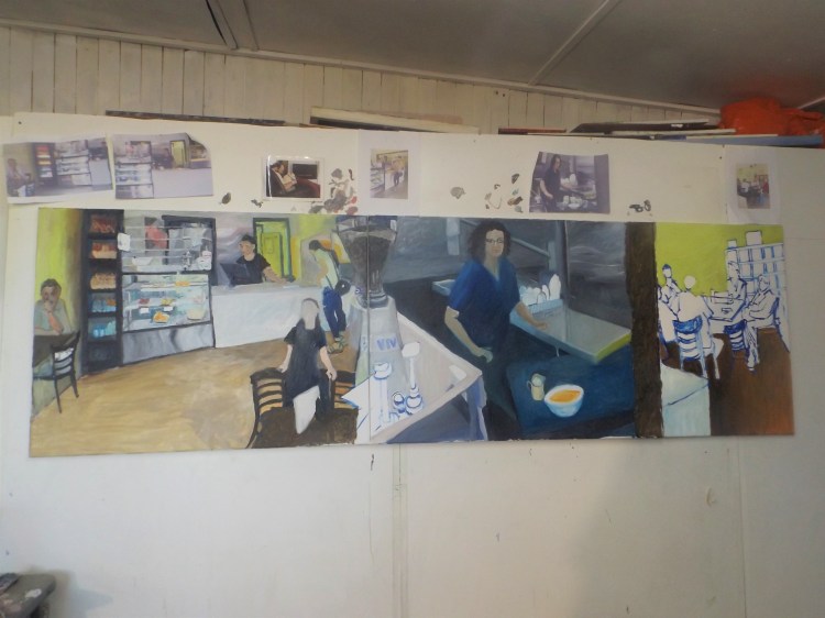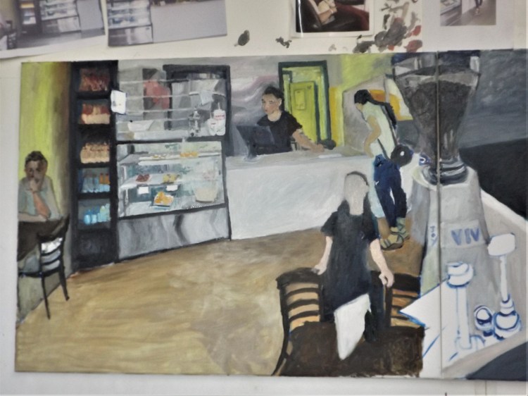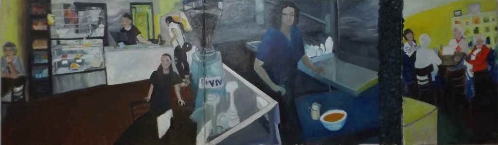 This painting is a composition based on the day to day running of Livindi Restaurant in the Stawell main street. Marleen shows my work in her Restaurant and Café.