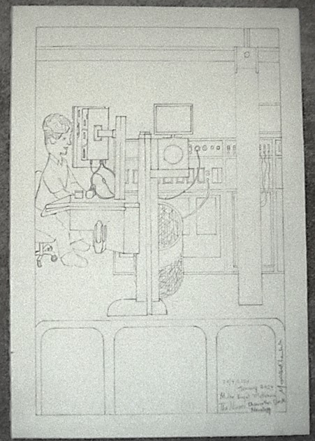 Right: In neurosurgery post operative 30th January 2024 ,(nurse at computer station) (2024) graphite on Fabriano per Aquarello hot pressed smooth white 200gsm.