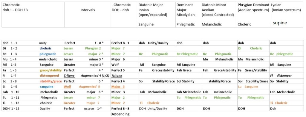 Below is the makeup of the modes of the musical scale. The modes are worked out chromatically: the study of this is ongoing.