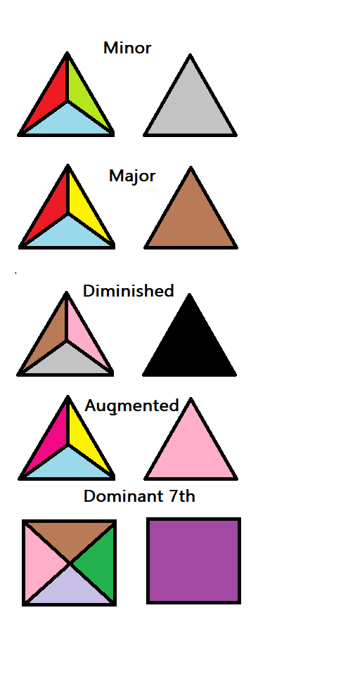 The isosceles triangles on the right sides of the pyramids are the seats of the pyramids and also the square at the seat of the tetrahedron; the colours of the “seats” are identifiers of the degrees of the chromatic scale that in music are the sounds that make up the place of the chords relative to the chromatic positions they sit and their “timbre” or “tone colour”