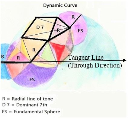 An expression through study of the melodic curvature (Dynamic Curve) in relation to the Tangent Line. These constructs show through the direction in space an time. The colours form the expressions of emotional tone suspending the linear theme above, in music such a theme might be the melody.